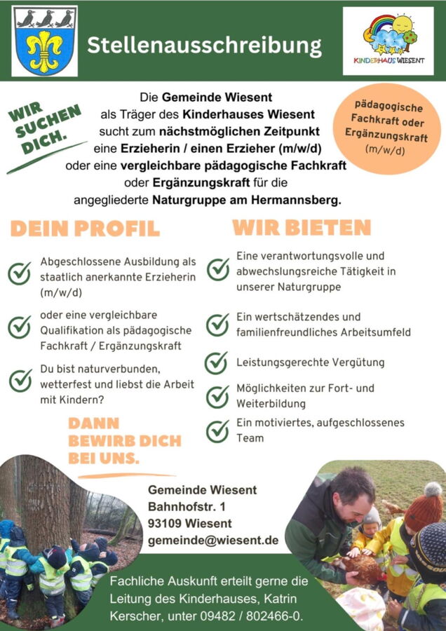 Ab einem Jahr bis hin zum Schuleintritt - in unserem Kinderhaus werden alle Kinder mit offenen Armen begrüßt. Wir bestehen aus einer Kinderkrippe und einem Kindergarten und befinden uns in unmittelbarer Nähe zur Ortsmitte von Wiesent.